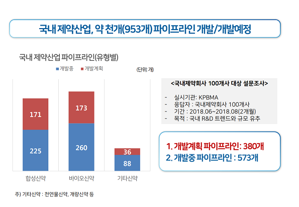 Á¶»ç °á°ú ±¹³» Á¦¾à»ç°¡ °³¹ßÁßÀ̰ųª °³¹ß ¿¹Á¤ÀÎ ½Å¾àÀº 1000°³¿¡ À°¹ÚÇÏ´Â 953°³·Î ³ªÅ¸³µ´Ù. ÇöÀç °³¹ßÁßÀÎ ½Å¾à(573°³)°ú ÇâÈÄ 10³â ³» °³¹ßÇÒ °èȹÀÌ ÀÖ´Â ½Å¾à ÆÄÀÌÇÁ¶óÀÎ(380°³)À» °¢°¢ ÇÕÇÑ ¼öÄ¡´Ù.