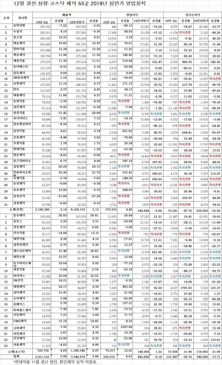 Àϰ£º¸»ç¡¤ÀÇÇнŹ®ÀÌ ±ÝÀ¶°¨µ¶¿ø º¸°í¼¸¦ Åä´ë·Î À¯ÇѾçÇà µî ÄÚ½ºÇÇ »óÀå Á¦¾à 31°÷, µ¿±¹Á¦¾à µî ÄÚ½º´Ú »óÀå Á¦¾à 22°÷ µî 53°÷À» ´ë»óÀ¸·Î 2019³â 2ºÐ±â ¹× 1¡¤2ºÐ±â¸¦ ´õÇÑ »ó¹Ý±â ¿µ¾÷½ÇÀûÀ» Áý°èÇß´Ù.