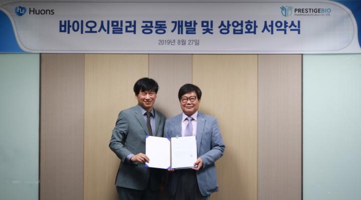 È޿½º ¾ö±â¾È ´ëÇ¥(¿À¸¥ÂÊ)¿Í ÇÁ·¹½ºÆ¼Áö¹ÙÀÌ¿ÀÁ¦¾à ±èÁø¿ì ´ëÇ¥°¡ ¾ç»ç°£ ¹ÙÀÌ¿À½Ã¹Ð·¯ ±¹³» µ¶Á¡ Á¦Á¶¡¤»ý»ê ¹× ÆÇ¸Å¿¡ ´ëÇÑ °è¾à ü°áÈÄ ±â³äÃÔ¿µ Çϰí ÀÖ´Ù. |