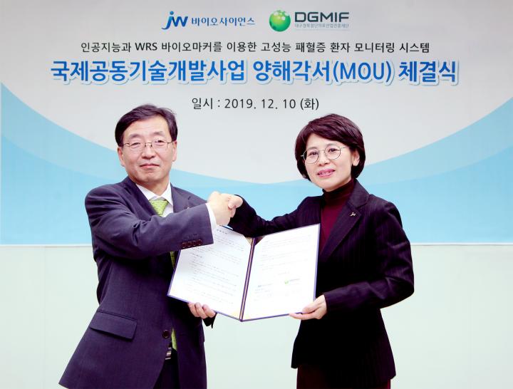 ÇÔÀº°æ JW¹ÙÀÌ¿À»çÀ̾𽺠´ëÇ¥(¿À¸¥ÂÊ)¿Í ÀÌ¿µÈ£ ´ë±¸°æºÏ÷´ÜÀÇ·á»ê¾÷ÁøÈïÀç´Ü ÀÌ»çÀåÀÌ ÆÐÇ÷Áõ È¯ÀÚ °¨½Ã ½Ã½ºÅÛ °³¹ßÀ» À§ÇÑ ¾çÇØ°¢¼­(MOU) Ã¼°áÈÄ ±â³äÃÔ¿µ Çϰí ÀÖ´Ù.