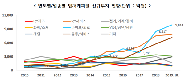 À̷νá Áö³ÇØ¿¡ ÀÌ¾î ¿ÃÇØµµ ¹ÙÀÌ¿À/ÀÇ·á°¡ VCÀÇ ÃÖ´ë ÅõÀÚ ¾÷Á¾ÀÌ µÉ °ÍÀ¸·Î Àü¸ÁµÈ´Ù. 10¿ù ±âÁØ ¾÷Á¾º° VC ½Å±Ô ÅõÀÚ ºñÁßÀº ¹ÙÀÌ¿À/ÀÇ·á 27.9%, ICT¼ºñ½º 22.2%, À¯Åë/¼ºñ½º 20.1%, ¿µ»ó/°ø¿¬/À½¹Ý 8.6%, Àü±â/±â°è/Àåºñ 4.5%, ICTÁ¦Á¶ 3% ¼øÀ̾ú´Ù.