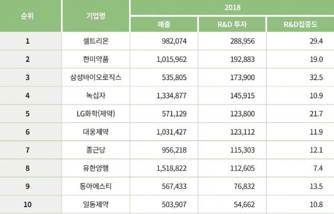 ÀÌ´Â ¸ÅÃâ ´ëºñ 9.1%¿¡ ´ÞÇÏ´Â ¼öÁØÀ̸ç, »óÀå Á¦¾à±â¾÷ÀÇ ¿¬±¸°³¹ßºñ´Â ÃÖ±Ù 5³â°£(2014~2018³â) ¸ÅÇØ Æò±Õ 15.2% Áõ°¡Çß´Ù. »óÀå»ç Áß R&D ÅõÀÚ°¡ °¡Àå ¸¹ÀÌ ÀÌ·ïÁø ±â¾÷Àº ¼¿Æ®¸®¿ÂÀ̾ú´Ù. Áö³ÇØ ¼¿Æ®¸®¿Â ¸ÅÃâÀº 9821¾ï¿øÀ¸·Î, ÀÌÁß R&DÅõÀڱݾ×Àº 2890¾ï¿ø(29.4%) À̾ú´Ù. µÎ ¹øÂ° ÀÚ¸®¿¡ ¿À¸¥ Çѹ̾àǰÀÇ °æ¿ì Áö³ÇØ ¸ÅÃâ¾× 1Á¶160¾ï¿ø¿¡¼ R&D ÅõÀÚºñ°¡ 1928¾ï8300¸¸¿øÀ¸·Î, 19% Á¤µµÀÇ ºñÁßÀ» °¡Á³´Ù. »ï¼º¹ÙÀÌ¿À·ÎÁ÷½ºÀÇ ¸ÅÃâ ´ëºñ R&D ºñÁßÀº 32.5%·Î »óÀå»ç °¡¿îµ¥ °¡Àå ³ô¾Ò´Ù. »ï¼º¹ÙÀÌ¿ÀÀÇ ¸ÅÃâ¾× 5358¾ï¿ø °¡¿îµ¥ R&D ÅõÀÚ´Â 1739¾ï¿øÀ¸·Î 3ºÐÀÇ 1 ¼öÁØÀ¸·Î ÆÄ¾ÇµÆ´Ù. 4À§´Â GC³ì½ÊÀÚ°¡ Â÷ÁöÇß´Ù. GC³ì½ÊÀÚÀÇ ¸ÅÃâ¾×Àº 1Á¶3349¾ï¿øÀ¸·Î, R&D ÅõÀÚºñ´Â 1459¾ï¿øÀÎ 10.9% ¼öÁØÀ¸·Î Áý°èµÆ´Ù. 5À§ÀÎ LGÈÇÐÀº ¸ÅÃâ ´ëºñ R&D ÅõÀÚ ºñÁßÀÌ 20%¸¦ ³Ñ¾ú´Ù. Áö³ÇØ LGÈÇÐ ¸ÅÃâÀº 5711¾ï¿øÀ̾úÁö¸¸, R&D ÅõÀÚºñ´Â 1238¾ï¿øÀ» ±â·ÏÇϸç, 21.7%ÀÇ ³ôÀº ÁýÁßµµ¸¦ º¸¿´´Ù. ´ë¿õÁ¦¾à°ú Á¾±Ù´çÀº °¢°¢ 6, 7À§¸¦ Â÷ÁöÇß´Ù. ´ë¿õÁ¦¾àÀÇ °æ¿ì ¸ÅÃâ 1Á¶314¾ï¿ø °¡¿îµ¥ R&D ÅõÀÚºñ°¡ 1231¾ï¿ø(11.9%)À» ±â·ÏÇß´Ù. ¹Ý¸é Á¾±Ù´çÀº ´ë¿õÁ¦¾àº¸´Ù R&D ÅõÀÚ¾×Àº Á¶±Ý Àû¾úÁö¸¸, ºñÁßÀº ´õ ³ô¾Ò´Ù. Á¾±Ù´çÀÇ Áö³ÇØ ¸ÅÃâ 9562¾ï¿ø Áß R&D ÅõÀÚ¾×Àº 1153¾ï¿øÀ¸·Î, ÀÌ´Â 12.1% Á¤µµ´Ù. 8À§¸¦ Â÷ÁöÇÑ À¯ÇѾçÇàÀº ¸ÅÃâ¾× 1Á¶5188¾ï¿ø Áß R&D ÅõÀÚ±ÝÀÌ 1126¾ï¿øÀ¸·Î R&D ÁýÁßµµ°¡ 7.4% Á¤µµ¿´´Ù. 1Á¶ Ŭ·´ Á¦¾à»ç ´ëºÎºÐ ¸ÅÃâ ´ëºñ R&D ºñÁßÀÌ 10%¸¦ ³Ñ¾î¼±´Ù´Â Á¡¿¡¼ ºñÁßÀÌ Å©Áö ¾ÊÀº ÆíÀÌ´Ù. µ¿¾Æ¿¡½ºÆ¼¿Í Àϵ¿Á¦¾àÀº °¢°¢ 9, 10À§¿¡ À̸§À» ¿Ã·È´Ù. µ¿¾Æ¿¡½ºÆ¼´Â ¸ÅÃâ¾× 5674¾ï¿ø Áß R&D ÅõÀÚ¾×ÀÌ 768¾ï¿øÀ¸·Î 13.5%¸¦ Â÷ÁöÇß°í, Àϵ¿Á¦¾àÀº 5039¾ï¿ø Áß R&D¿¡ 547¾ï¿øÀ» ½á 10.8%¸¦ ±â·ÏÇß´Ù. 11À§, 12À§¸¦ Â÷ÁöÇÑ JWÁß¿ÜÁ¦¾à°ú º¸·ÉÁ¦¾àÀº µÑ ´Ù 10% ¹Ì¸¸ÀÇ R&D ÅõÀÚºñÁßÀ» º¸¿´´Ù. JWÁß¿ÜÁ¦¾àÀÇ °æ¿ì ¸ÅÃâ 5372¾ï¿ø Áß R&D¿¡ 344¾ï¿ø(6.4%), º¸·ÉÁ¦¾àÀº 4604¾ï¿ø Áß 333¾ï¿ø(7.2%)À» ÅõÀÚÇß´Ù. ºÎ±¤¾àǰ°ú Çѱ¹À¯³ªÀÌÆ¼µåÁ¦¾àÀº 10%¸¦ »óȸÇÏ´Â ¸ÅÃâ ´ëºñ R&D ºñÁßÀ» º¸¿´´Ù. ºÎ±¤¾àǰÀº 1942¾ï¿ø Áß 298¾ï¿ø(15.3%), Çѱ¹À¯³ªÀÌÆ¼µåÁ¦¾àÀº 2120¾ï¿ø °¡¿îµ¥ 268¾ï¿ø(12.7%)À» ¹Ì·¡¿¡ ÅõÀÚÇß´Ù. ÀϾç¾àǰ, »ïÁøÁ¦¾à, ´ë¿øÁ¦¾à ¿ª½Ã ¸ðµÎ ÇÑÀÚ¸´¼ö ÅõÀÚºñÁßÀ» ±â·ÏÇß´Ù. ÀϾç¾àǰÀº ¸ÅÃâ 3000¾ï¿ø Áß 260¾ï¿ø(8.6%), »ïÁøÁ¦¾àÀº 2600¾ï¿ø Áß 253¾ï¿ø(9.7%), ´ë¿øÁ¦¾àÀº 2867¾ï¿ø Áß 241¾ï¿ø(8.4%)À» R&D¿¡ ÁöÃâÇß´Ù. ¸ÅÃâ »óÀ§ »óÀå»ç¿¡ ¼ÓÇÏ´Â Á¦ÀϾàǰÀº ¸ÅÃâ ´ëºñ R&D ºñÁßÀÌ °¡Àå ³·¾Ò´Ù. Á¦¾àÀÏǰÀº ¸ÅÃâ 6271¾ï¿ø Áß 259¾ï¿ø(4.1%)À» R&D¿¡ ÁöÃâÇß´Ù. R&D ÅõÀڱݾ×À¸·Î¸¸ µûÁö¸é 16À§´Ù. 19À§¿Í 20À§´Â ÄÚ¿À·Õ»ý¸í°úÇаú ¸ÞƼÅ彺°¡ Â÷ÁöÇß´Ù. ÄÚ¿À·Õ»ý¸í°úÇÐÀÇ °æ¿ì ¸ÅÃâ¾× 1327¾ï¿ø Áß 229¾ï¿ø(17.3%), ¸ÞµðÅ彺´Â 2054¾ï¿ø Áß 221¾ï¿ø(10.8%)À» R&D¿¡ ÅõÀÚÇß´Ù. |