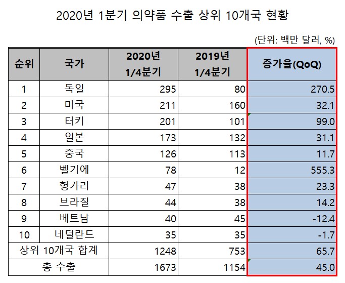 ÇÑÆí 2020³â 1ºÐ±â ±¹°¡º° ÀǾàǰ ¼öÃâ¾×Àº µ¶ÀÏÀÌ 3¾ï ´Þ·¯(¾à 3700¾ï ¿ø)·Î Áö³­ÇØ µ¿±â´ëºñ 270.5% Áõ°¡Çϸç 1À§¸¦ ±â·ÏÇß°í ±× µÚ·Î ¡â¹Ì±¹ 2¾ï1000¸¸ ´Þ·¯(¾à 2600¾ï¿ø), 32.1% Áõ°¡ÇÑ ¡âÅÍŰ 2¾ï ´Þ·¯(¾à 2450¾ï ¿ø), 99% Áõ°¡ ¡âÀϺ» 1¾ï 7000¸¸ ´Þ·¯(¾à 2100¾ï ¿ø), 31.1% Áõ°¡ µîÀÇ  ¼øÀ¸·Î ³ªÅ¸³µ´Ù.