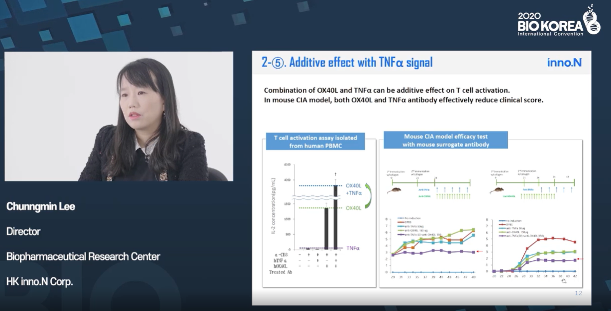 HKÀ̳뿣ÀÌ °³¹ß ÁßÀÎ ÀÌÁßÇ×ü ½Å¾à ¹°Áú(°³¹ß¸í INB004)Àº OX40L¿Í TNF-¥á¸¦ µ¿½Ã¿¡ Ÿ±êÇÑ´Ù. È޹̶ó, ·¹¹ÌÄÉÀÌµå µî ´Ù¾çÇÑ ÀÚ°¡¸é¿ªÁúȯ Ä¡·áÁ¦°¡ ½ÃÆÇ ÁßÀÌÁö¸¸ ´ëºÎºÐ Áï°¢ÀûÀ¸·Î ¹ÝÀÀÇÏ´Â ³»Àç¸é¿ª(innate immunity)¿¡ ÁýÁߵŠÀÖ´Ù. ȸ»ç´Â Àå±âÀûÀÎ ¹ÝÀÀÀ» º¸ÀÏ ¼ö ÀÖ´Â ÀûÀÀ¸é¿ª(adaptive immunity)À» °°ÀÌ Á¦¾îÇÏ¸é ±âÁ¸ ÀǾàǰÀÇ ¹ÝÀÀ·üÀ» ³ôÀÏ ¼ö ÀÖÀ» °ÍÀ̶ó ºÃ´Ù. ³»Àç¸é¿ª¿¡¼­´Â TNF-¥á, ÀûÀÀ¸é¿ª¿¡¼­´Â OX40LÀ» ÅÃÇß´Ù.