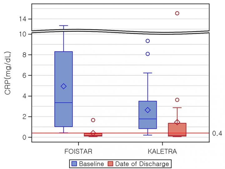 È£À̽ºÅ¸Á¤ º¹¿ë±ºÀº ÀÔ¿ø ´ç½Ã CRP ºñÁ¤»ó ¼öÄ¡¸¦ º¸¿´´ø 7¸íÀǠȯÀÚ Áß 6¸í(85.71%)ÀÌ Á¤»ó ¹üÀ§·Î Á¶ÀýµÆ´Ù. ¹Ý¸é Ä®·¹Æ®¶óÁ¤ º¹¿ë±ºÀº ÀÔ¿ø ´ç½Ã CRP ºñÁ¤»ó ¼öÄ¡¸¦ º¸¿´´ø 18¸íÀǠȯÀÚ Áß 11¸í(61.11%)ÀÌ Á¤»ó ¹üÀ§·Î Á¶ÀýµÆÀ¸¸ç, ÀÔ¿ø ´ç½Ã CRP Á¤»ó ¼öÄ¡¸¦ º¸¿´´ø 2¸íÀǠȯÀÚ Áß 1¸í(50%)ÀÌ Á¤»ó ¹üÀ§¸¦ À¯ÁöÇß´Ù.