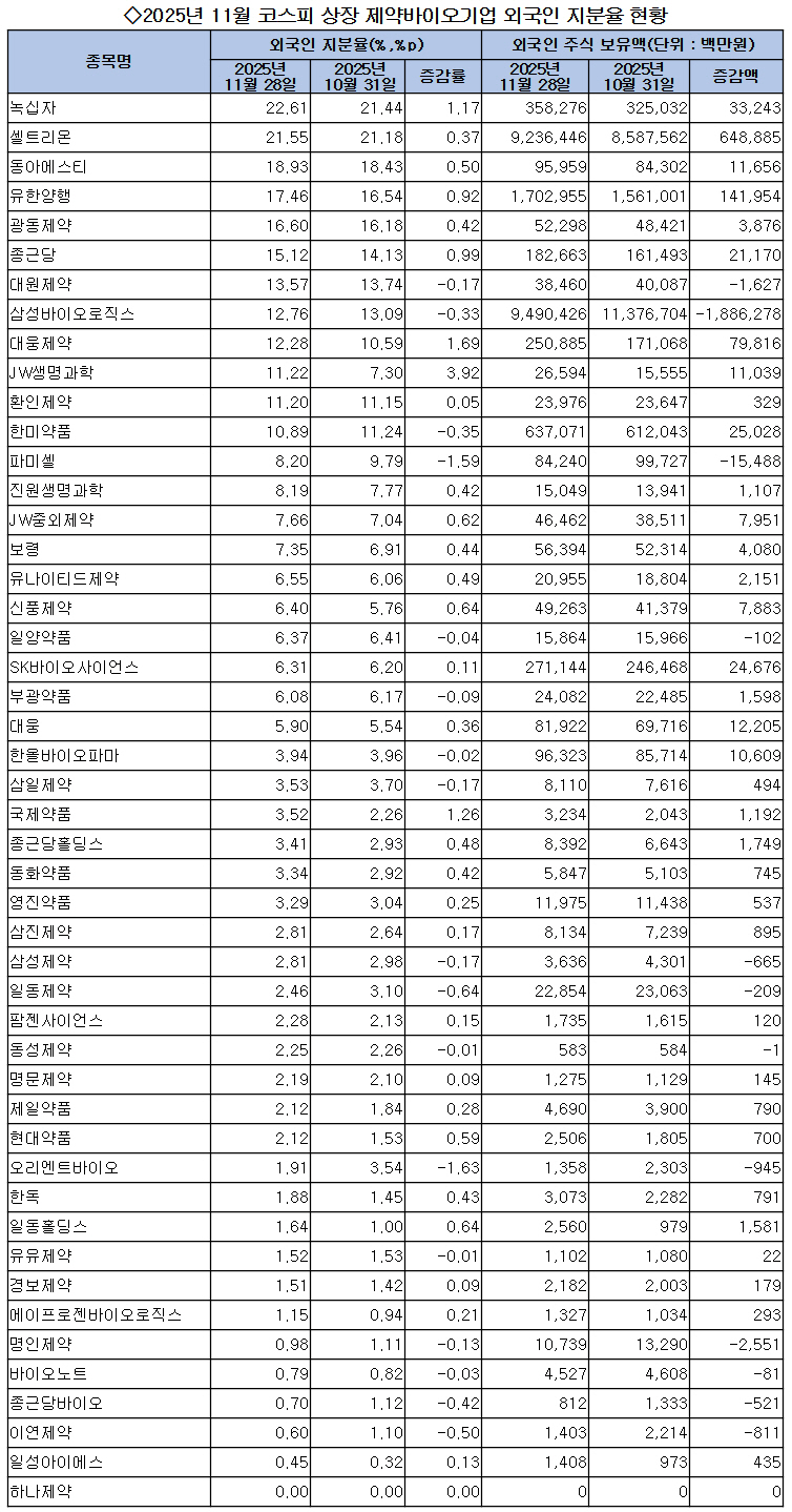 Àϰ£º¸»ç¡¤ÀÇÇнŹ®ÀÌ ÄÚ½ºÇÇ Á¦¾àÁö¼ö¿¡ Æ÷ÇÔµÈ 48°³ Á¦¾à¹ÙÀÌ¿À±â¾÷µéÀÇ ¿Ü±¹ÀÎ ÁöºÐÀ² º¯µ¿ ÇöȲÀ» ºÐ¼®ÇÑ °á°ú 2025³â 11¿ù 28ÀÏ ±âÁØ JW»ý¸í°úÇÐ, ´ë¿õÁ¦¾à, ±¹Á¦¾àǰ, CG³ì½ÊÀÚ, Á¾±Ù´ç, À¯ÇѾçÇà, ½ÅdzÁ¦¾à, Àϵ¿È¦µù½º, JWÁß¿ÜÁ¦¾à, Çö´ë¾àǰ, µ¿¾Æ¿¡½ºÆ¼, Çѱ¹À¯³ªÆ¼À̵åÁ¦¾à, Á¾±Ù´çȦµù½º, º¸·É, Çѵ¶, ±¤µ¿Á¦¾à, µ¿È¾àǰ µî 30°³»çÀÇ ¿Ü±¹ÀÎ ÁöºÐÀ²ÀÌ Áö³ 10¿ù 31ÀÏ ´ëºñ Áõ°¡Çß´Ù.