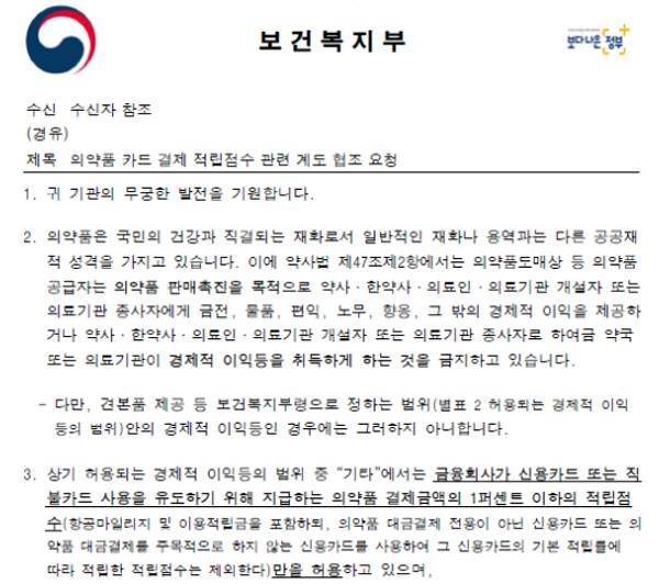 º¹ÁöºÎ°¡ ¾à±¹ ¹× µµ¸Å»ó ÀǾàǰ °áÁ¦ Ä«µå ½ÇÅÂÁ¶»ç °ü·Ã ±ÝÀ¶´ç±¹¿¡ Àü´ÞÇÑ ÇùÁ¶ °ø¹®