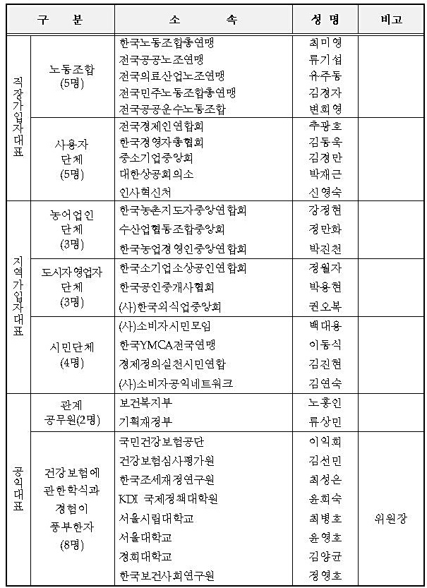 °Çº¸°ø´Ü ÀçÁ¤¿î¿µÀ§´Â Á÷Àå°¡ÀÔÀÚ ´ëÇ¥(³ëµ¿Á¶ÇÕ 5ÀÎ, »ç¿ëÀÚ ´Üü 5ÀÎ), Áö¿ª°¡ÀÔÀÚ ´ëÇ¥(³ó¾î¾÷ÀÎ ´Üü 3ÀÎ, µµ½ÃÀÚ¿µ¾÷ÀÚ ´Üü 3ÀÎ, ½Ã¹Î´Üü 4ÀÎ), °øÀÍ´ëÇ¥(°ü°è °ø¹«¿ø 2ÀÎ, °Ç°º¸Çè ÇÐÀÚ 8ÀÎ)·Î ¿î¿µµÈ´Ù.