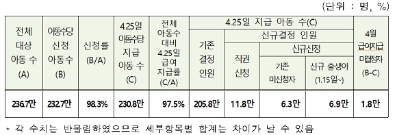 4¿ù 22ÀÏ ±âÁØÀ¸·Î 232¸¸ 7000¿© ¸í(¸¸ 6¼¼ ¹Ì¸¸ Àüü ¾Æµ¿ Áß 98.3%)ÀÌ ½ÅûÇß°í, ÀÌ Áß ½Åû¼­ ±âÀç ¿À·ù µîÀ¸·Î Ãß°¡ È®ÀÎÀÌ ÇÊ¿äÇÑ 1¸¸ 8000¿© ¸íÀ» Á¦¿ÜÇÑ 230¸¸ 8000¿© ¸í¿¡°Ô ¾Æµ¿¼ö´çÀÌ Áö±ÞµÈ´Ù.