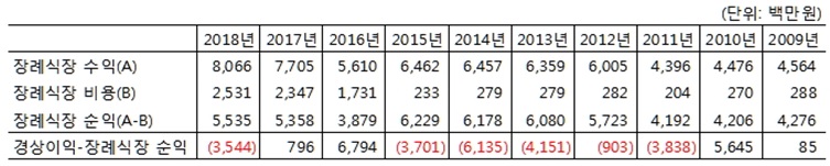 ½Ã¼³¿î¿µ ¼öÀÍ Áß °¡Àå Å« ºñÁßÀ» Â÷ÁöÇÑ °Ç Àå·Ê½ÄÀå ¿î¿µÀ¸·Î 2018³âµµ¸¸ ÇØµµ 81¾ï¿øÀÇ ¼öÀÍÀ» ¿Ã·È°í, ÀåÀÇ¿ëǰ ¸ÅÀÔºñ¿Í Àå·Ê½ÄÀå ±Þ½ÄÀç·áºñ¸¦ ÇÕÇÑ 25¾ï¿øÀ» Á¦ÇÏ´õ¶óµµ ¹«·Á 55¾ï¿øÀÇ ÈæÀÚ¸¦ ±â·ÏÇß´Ù.