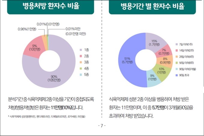 ![]() ¹®Á¦´Â ½Ä¿å¾ïÁ¦Á¦¸¦ ó¹æ ¹ÞÀº ȯÀÚ Áß ¾à 11¸¸ ¸í(10%)ÀÌ 2°³¼ººÐ ÀÌ»óÀ» ó¹æ¹Þ°Å³ª, Àüü ó¹æÀÇ 30%°¡ Åõ¿©±â°£ÀÌ 4ÁÖ¸¦ ÃʰúµÆ´Ù´Â Á¡ÀÌ´Ù.