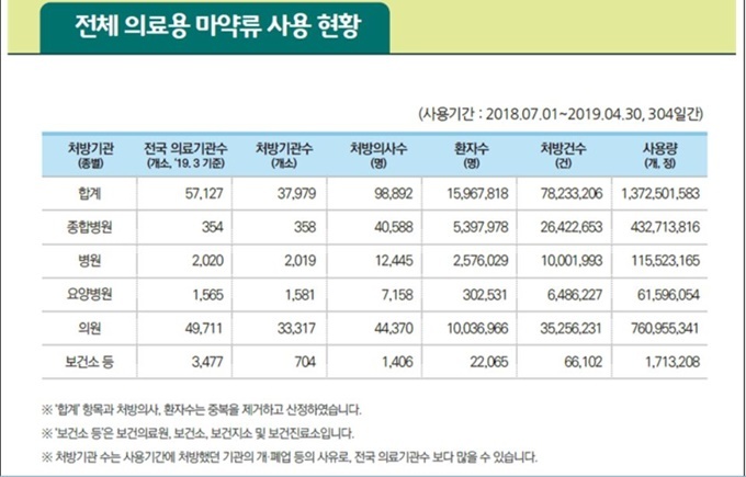 Àüü ÀÇ·á¿ë ¸¶¾à·ù »ç¿ëÀº Á¾ÇÕº´¿øÀ» Æ÷ÇÔÇÑ 5¸¸ 7127°÷¿¡¼ ÀÌ·ïÁ³°í, 󹿱â°ü¼öµµ 3¸¸ 7979°÷À̾ú´Ù. ó¹æÀÇ»ç ¼ö´Â 9¸¸ 8892¸íÀ̾ú´Ù.