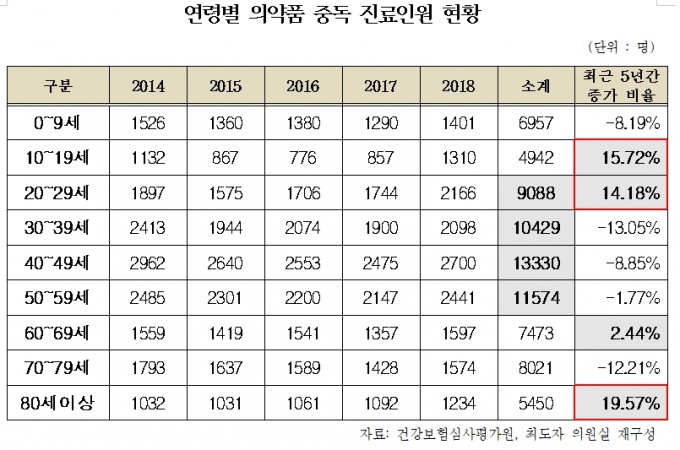 ƯÈ÷ ÃÖ±Ù 5³â°£ ¾à¹°Áßµ¶ ȯÀÚÁõ°¡À²Àº ´ëÀüÀÌ 79.8%·Î Àüü ½Ãµµ °¡¿îµ¥ °¡Àå ³ô¾Ò´Ù. ±¤ÁÖ 39.1%, ÀÎõ 18.6%, Ãæ³² 15.5%, ¼¿ï 13.7%ÀÌ ±× µÚ¸¦ À̾ú´Ù. ![]() ¿¬·Éº°·Î º¸¸é, 40´ë ¾à¹°Áßµ¶È¯ÀÚ°¡ 1¸¸3330¸íÀ¸·Î Àü ¿¬·ÉÃþ Áß °¡Àå ¸¹¾ÒÀ¸¸ç, 50´ë°¡ 1¸¸1574¸í, 30´ë 1¸¸429¸í, 20´ë 9088¸í ¼øÀ¸·Î Áý°èµÆ´Ù. ±×·¯³ª ´õ Å« ¹®Á¦´Â û¼Ò³â°ú û³âÃþ ¾à¹°Áßµ¶ ȯÀÚ°¡ 4³â »õ °¢°¢ 15.72%, 14.19% Áõ°¡ÇØ 80¼¼ ÀÌ»óÀ» Á¦¿ÜÇÑ Àü(îï) ¿¬·ÉÃþ¿¡¼ °¡Àå ³ôÀº Áõ°¡¼¼¸¦ º¸¿´´Ù´Â Á¡ÀÌ´Ù.