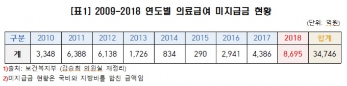 ±¹È¸ º¸°Çº¹ÁöÀ§¿øÈ¸ ±è½ÂÈñ ÀÇ¿ø(ÀÚÀ¯Çѱ¹´ç)ÀÌ °ø°³ÇÑ ÀÚ·á¿¡ µû¸£¸é 2018³â ¹ÌÁö±ÞµÈ ÀÇ·á±Þ¿©´Â 8695¾ï¿øÀ¸·Î ¿ª´ë ÃÖ´ëÄ¡ÀÌ´Ù.
