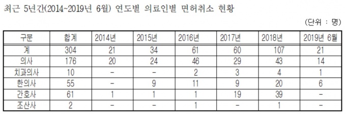¿¬µµº° ¸éÇã Ãë¼Ò ÀÇ·áÀÎÀ» ÀÚ¼¼È÷ »ìÆìº¸¸é 2014³â 21¸í, 2015³â 34¸í, 2016³â 61¸í, 2017³â 60¸í, 2018³â 107¸í, 2019³â 6¿ù±îÁö 21¸íÀ̾ú´Ù.