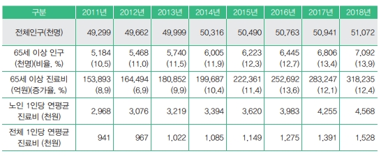 ³ëÀÎ Àα¸´Â 28¸¸6,000¸í ´Ã¾î³­ 709¸¸¸íÀ¸·Î Àüü Àα¸ÀÇ 13.9%¸¦ Â÷ÁöÇß°í, Àüü °Ç°­º¸Çè Áø·áºñ¿¡¼­ ³ëÀÎÁø·áºñ°¡ Â÷ÁöÇÏ´Â ºñÀ²Àº 40.8%¿´´Ù.
