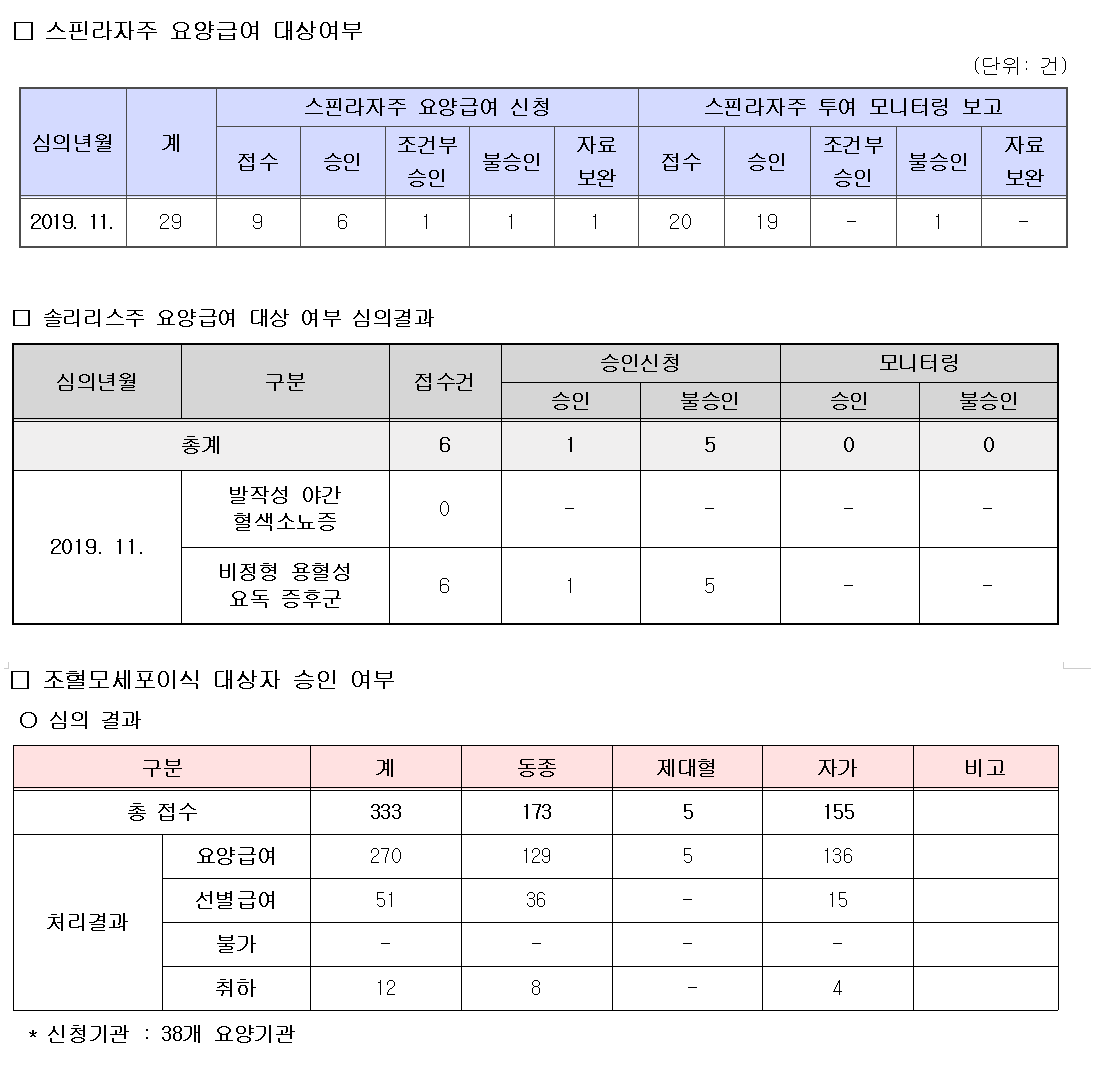 ½ÉÀÇ »ç·Ê´Â °¢°¢ ¡ãNusinersen sodium ÁÖ»çÁ¦(ǰ¸í: ½ºÇɶóÀÚÁÖ) ¡ã½É½Ç º¸Á¶ÀåÄ¡ Ä¡·á¼ú(VAD) ¡ãEculizumab ÁÖ»çÁ¦(ǰ¸í: ¼Ö¸®¸®½ºÁÖ) ¡ãÁ¶Ç÷¸ð¼¼Æ÷ÀÌ½Ä ¿ä¾ç±Þ¿© ´ë»ó ¿©ºÎ´Ù.