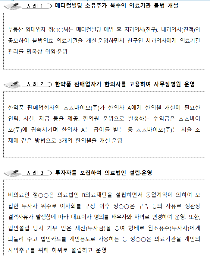 ´ëÇ¥ÀûÀÎ Àû¹ß »ç·Ê·Î ºñÀÇ·áÀÎÀÌ ÀÇ»ç¿Í °ø¸ðÇØ ÀÇ·á±â°üÀ» °³¼³‧¿î¿µÇϰųª ÀǾàǰ ÆÇ¸Å¾÷ÀڷκÎÅÍ ÀηÂ, ½Ã¼³, ÀÚ±ÝÀ» Á¦°ø¹Þ¾Æ ÀÇ·á±â°üÀ» °³¼³¡¤¿î¿µÇÏ´Â µî ´Ù¾çÇÑ ¼ö¹ýÀ¸·Î »ç¹«À庴¿øÀ» ¿î¿µÇϰí ÀÖ¾ú´Ù. ![]() ÇÕµ¿Á¶»ç´Â ºÒ¹ý°³¼³ ÀÇ·á±â°üÀÇ º¸Çè±Þ¿© ºÎÁ¤¼ö±ÞÀÌ ±¹¹Î°Ç°º¸Çè ÀçÁ¤ °ÇÀü¼º°ú ÀǷἺñ½º ÁúÀ» ÀúÇϽÃÄÑ ±¹¹ÎÀÇ °Ç°À» À§ÇùÇÔ¿¡ µû¶ó »ýȰÀûÆó ÇØ¼Ò ÀÏȯÀ¸·Î ½Ç½ÃµÆ´Ù.