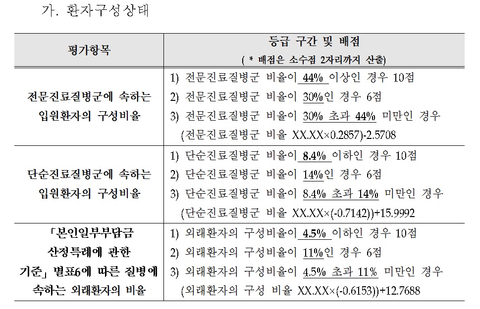 °³Á¤¾È¿¡ µû¸£¸é Àü¹®Áø·áÁúº´±º¿¡ ¼ÓÇÏ´Â ÀÔ¿øÈ¯ÀÚÀÇ ºñÀ²Àº ÇØ´ç ÀÇ·á±â°üÀÌ Áø·áÇÑ Àüü ÀÔ¿øÈ¯ÀÚÀÇ 21%¿¡¼­ 30%ÀÌ»óÀ¸·Î »óÇâµÆ´Ù. ¶Ç ÀÌ ºñÀ²ÀÌ 30%ÀÎ °æ¿ì¿¡´Â 6Á¡, 44%ÀÌ»óÀÎ °æ¿ì ÃÖ°íÁ¡ÀÎ 10Á¡À» ¹Þ´Â´Ù.