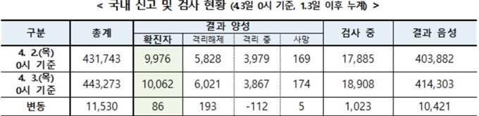 Äڷγª19 Áø´Ü °Ë»ç¸¦ ¹ÞÀº »ç¶÷Àº È®ÁøÀÚ¸¦ Æ÷ÇÔÇØ 44¸¸ 3273¸íÀÌ´Ù. ÀÌ Áß 41¸¸ 4303¸íÀÌ À½¼ºÀ¸·Î È®ÀεƴÙ. 1¸¸ 8908¸íÀº °Ë»ç °á°ú¸¦ ±â´Ù¸®°í ÀÖ´Ù.