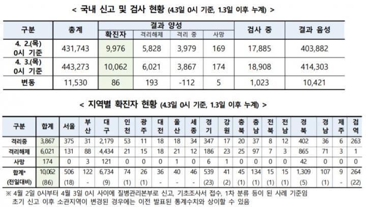 Áúº´°ü¸®º»ºÎ Á߾ӹ濪´ëÃ¥º»ºÎ(º»ºÎÀå Á¤Àº°æ)´Â 4¿ù 3ÀÏ 0½Ã ±âÁØ, ÃÑ ´©Àû È®ÁøÀÚ¼ö´Â 1¸¸ 62¸íÀ̸ç ÀÌ Áß 6021¸íÀÌ °Ý¸®ÇØÁ¦µÆ´Ù°í ¹àÇû´Ù.