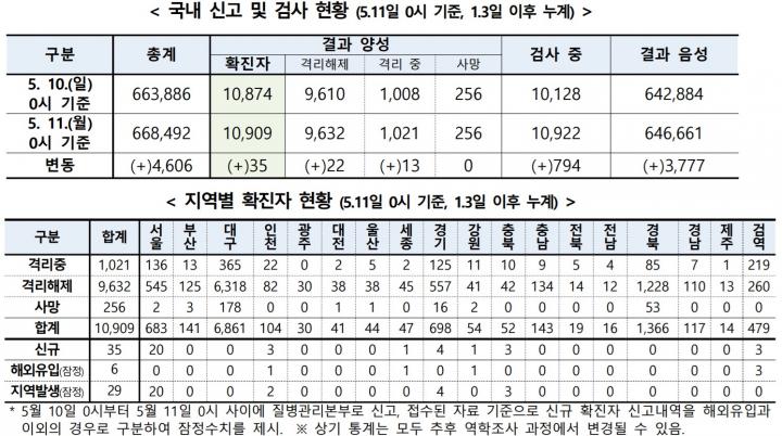 Áúº´°ü¸®º»ºÎ Á߾ӹ濪´ëÃ¥º»ºÎ(º»ºÎÀå Á¤Àº°æ)´Â 5¿ù 11ÀÏ 0½Ã ±âÁØ, ÃÑ ´©Àû È®ÁøÀÚ¼ö´Â 1¸¸ 909¸íÀ̸ç ÀÌ Áß 9632¸íÀÌ °Ý¸®ÇØÁ¦ µÆ´Ù°í ¹àÇû´Ù.