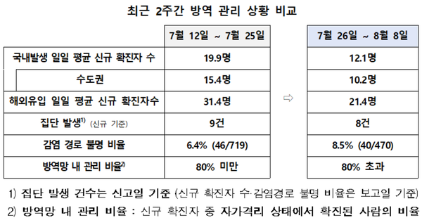 7¿ù 26ÀϺÎÅÍ 8¿ù 8ÀϱîÁö ÃÖ±Ù 2ÁÖ°£À» »ìÆìº¸¸é ÀÏ Æò±Õ ±¹³» ¹ß»ý ȯÀÚ ¼ö´Â 12.1¸íÀ¸·Î ÀÌÀü 2ÁÖ°£ÀÎ 7¿ù 12ÀϺÎÅÍ 25ÀϱîÁöÀÇ 19.9¸í¿¡ ºñÇØ 7.8¸í °¨¼ÒÇß´Ù.