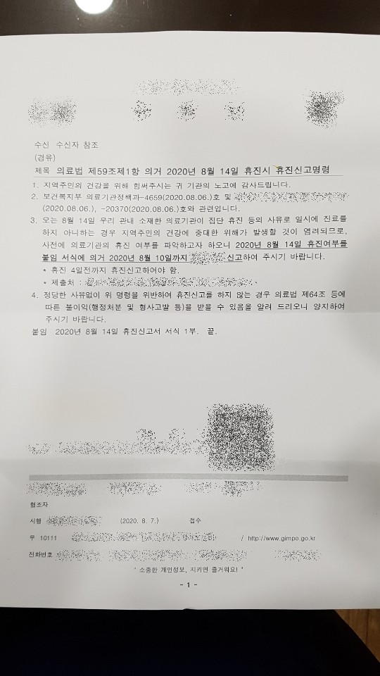 ÀÌ¿¡ °¢ ÁöÀÚü´Â º¸°Ç¼Ò¸¦ ÅëÇØ Àϼ± ÀÇ·á±â°ü¿¡ ÃÖ±Ù ÀÇ·á¹ý Á¦59Á¶Á¦1Ç׿¡ µû¸¥ 8¿ù 14ÀÏ ÈÞÁø½Ã ÈÞÁø½Å°í¸í·É °ø¹®À» ¹ß¼ÛÇß´Ù. ÈÞÁø½Å°í¸í·É °ø¹®Àº ¾÷¹«°³½Ã¸í·É°ú ´Þ¸® ÈÞÁø »çÀ¯¿¡ ´ëÇØ »çÈÄüũÇÒ ¼ö ÀÖ´Â ±Ù°Å°¡ ¾ø´Ù.