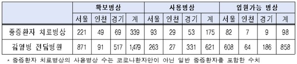 ÀÎõÀÇ °æ¿ì ÁßÁõȯÀÚ Ä¡·áº´»ó 49°³ Áß 29°³, °¨¿°º´ Àü´ãº´¿ø 91°³ Áß 27°³¸¦ »ç¿ëÇØ °¢°¢ 7°³, 64°³ º´»ó ¿©À¯°¡ ÀÖÀ¸¸ç, °æ±â´Â ÁßÁõȯÀÚ Ä¡·áº´»ó 69º´»ó Áß 53°³, °¨¿°º´ Àü´ãº´¿ø 517°³ º´»ó Áß 331°³¸¦ »ç¿ëÇØ °¢°¢ 9°³, 186°³ º´»ó ¿©À¯°¡ ÀÖ´Â »óȲÀÌ´Ù.