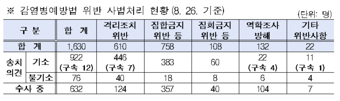 ´õºÒ¾î¹ÎÁÖ´ç ±è¿øÀÌ ±¹È¸ÀÇ¿ø(º¸°Çº¹ÁöÀ§¿øÈ¸, Àü³² ¸ñÆ÷½Ã)ÀÌ °æÂûûÀ¸·ÎºÎÅÍ Á¦Ãâ¹ÞÀº ¡®Äڷγª19 ¹ß»ý ÀÌÈÄ °¨¿°º´¿¹¹æ¹ý À§¹Ý¿¡ µû¸¥ »ç¹ýó¸® ÇöȲ¡¯ ÀÚ·á¿¡ µû¸£¸é 8¿ù 26ÀÏ ±âÁØÀ¸·Î ÃÑ 1630¸íÀÌ °¨¿°º´¿¹¹æ¹ýÀ» À§¹ÝÇÑ °ÍÀ¸·Î ³ªÅ¸³µ´Ù.