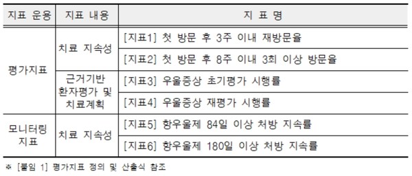 Æò°¡´Â ¡ãù ¹æ¹® ÈÄ 3ÁÖ À̳» Àç¹æ¹®À² ¡ã8ÁÖ À̳» 3ȸ ÀÌ»ó ¹æ¹®À² ¡ãÇ׿ì¿ïÁ¦ 84ÀÏ ÀÌ»ó 󹿷ü ¡ã180ÀÏ ÀÌ»ó 󹿷ü ¡ã¿ì¿ï Áõ»ó ÃʱâÆò°¡ ½ÃÇà·ü ¡ãÀçÆò°¡ ½ÃÇà·ü µî 6°³ ÁöÇ¥¿¡ ´ëÇØ ½Ç½ÃµÈ´Ù.