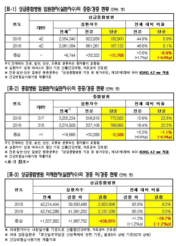 Á¾ÇÕº´¿øÀÇ ÀÔ¿øÈ¯ÀÚ ¼ö(½ÇȯÀÚ)´Â 2018³â 325¸¸5,234¸í¿¡¼ 2019³â 327¸¸4,929¸íÀ¸·Î 1¸¸9,695¸í Áõ°¡Çß´Ù. ±×·¯³ª ÁßÁõȯÀÚÀÇ ºñÀ²Àº 2018³â 15.6%¿¡¼ 2019³â 16.4%·Î 0.8%p Áõ°¡ÇÑ ¹Ý¸é, °æÁõȯÀÚ´Â 2018³â 23.8%¿¡¼ 2019³â 23.5%·Î -0.3%p°¨¼ÒÇÑ °ÍÀ¸·Î ³ªÅ¸³µ´Ù.