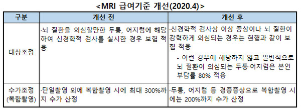 ±×³ª¸¶ ¿ÃÇØ 4¿ù MRI °Ë»ç ±Þ¿© ±âÁØÀ» °­È­ÇÑ ÀÌÈÄ °Ç°­º¸Çè ÀçÁ¤ ÁöÃâÀÌ °¨¼ÒÇß´Ù´Â °Ô ³² ÀÇ¿øÀÇ ÁöÀûÀÌ´Ù. ÀϹÝÀûÀ¸·Î ³ú ÁúȯÀÌ ÀǽɵǴ µÎÅëÀ̳ª ¾îÁö·³ÁõÀº º»Àκδã·ü 80%°¡ Àû¿ëµÇµµ·Ï ±Þ¿© ±âÁØÀÌ °­È­µÆ´Ù.