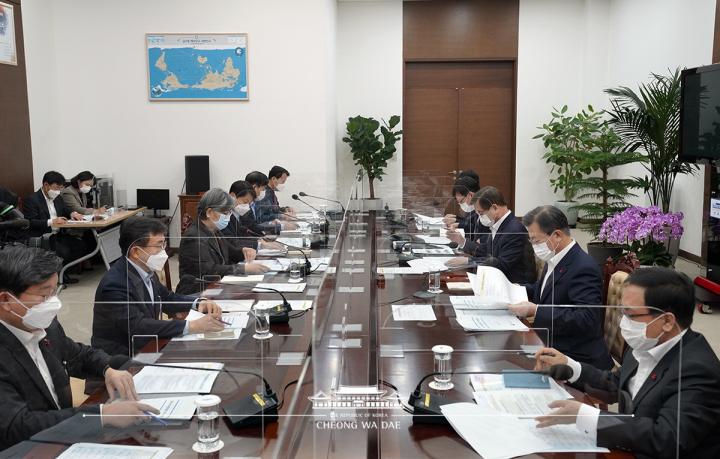 Áö³­ 15ÀϠû¿Í´ë¿¡¼­ ÁøÇàµÈ Äڷγª19 ¿¹¹æÁ¢Á¾ Áغñ °èȹ º¸°í. ¹®ÀçÀΠ´ëÅë·É ÁÖÀçÇÏ¿¡ ÁøÇàµÆÀ¸¸ç ÀüÇØÃ¶ ÇàÁ¤¾ÈÀüºÎ Àå°ü, ±Ç´öö º¸°Çº¹ÁöºÎ Àå°ü, ±¸À±Ã¶ ±¹¹«Á¶Á¤½ÇÀå, ±è°­¸³ ½ÄǰÀǾàǰ¾ÈÀüóÀå, ¹ÚÁÖ°æ À°±º Âü¸ðÂ÷Àå, ¼Û¹ÎÇå °æÂûû Â÷Àåµµ Âü¼®Çß´Ù. »çÁø Ãâó´Â Ã»¿Í´ë È¨ÆäÀÌÁö.