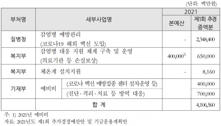 °¢ »ç¾÷º° ±¸Ã¼ÀûÀÎ ³»¿ëÀ» º¸¸é, ¿ì¼± º¹ÁöºÎ´Â Äڷγª19 °¨¿°È¯ÀÚ¸¦ Àü´ã Ä¡·áÇÏ´Â ÀÇ·á±â°üÀÇ ¼Õ½Çº¸»ó ¿¹»ê 6500¾ï¿øÀ» Áõ¾×ÇßÀ¸¸ç Áúº´Ã»¿¡¼´Â Äڷγª ¹é½Å ±¸¸Å ´ë±ÝÀ» È®º¸Çϱâ À§ÇØ ¡®°¨¿°º´ ¿¹¹æ°ü¸®(Äڷγª19 ÇØ¿Ü ¹é½Å µµÀÔ)¡¯ »ç¾÷¿¡ 2Á¶ 3484¾ï ¿øÀ» ½Å±Ô·Î ¹Ý¿µÇß°í ±âÀçºÎ´Â Äڷγª ¹é½Å ¿¹¹æÁ¢Á¾ ¼¾ÅÍ ¼³Ä¡¡¤¿î¿µ(4000¾ï¿ø) ¹× Äڷγª °¨¿°È¯ÀÚ Áø´Ü¡¤°Ý¸®¡¤Ä¡·á(7000¾ï¿ø) µîÀ» À§ÇØ ÃÑ 1Á¶ 1000¾ï¿øÀÇ ¿¹ºñºñ¸¦ Áõ¾×Çß´Ù.