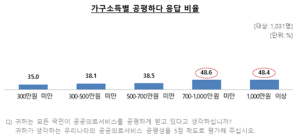 ¼Òµæº°·Î °ø°øÀ¸·á¼­ºñ½º¸¦ °øÆòÇÏ´Ù°í »ý°¢ÇÏ´Â ºñÀ²À» »ìÆìº¸¸é ¡ã300¸¸¿ø ¹Ì¸¸ 35% ¡ã300¸¸¿ø ÀÌ»ó 500¸¸¿ø ¹Ì¸¸ 38.1% ¡ã500¸¸¿ø ÀÌ»ó 700¸¸¿ø ¹Ì¸¸ 38.5% ¡ã700¸¸¿ø ÀÌ»ó 1,000¸¸¿ø ¹Ì¸¸ 48.6% ¡ã1,000¸¸¿ø ÀÌ»ó 48.4%·Î ¼ÒµæÀÌ ³ôÀ» ¼ö·Ï °øÆòÇÏ´Ù°í »ý°¢ÇÏ´Â °ÍÀ¸·Î ³ªÅ¸³µ´Ù.