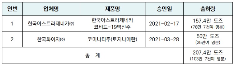 À̷νá ÇöÀç±îÁö ¹é½Å °øµ¿±¸¸Å¡¤¹èºÐ ±â±¸ÀÎ Äڹ齺 ÆÛ½Ç¸®Æ¼(COVAX Facility, ÀÌÇÏ Äڹ齺)¸¦ ÅëÇØ µé¾î¿Â ¹é½ÅÀ» Á¦¿ÜÇϰí Á¤ºÎ¿Í ¹é½Å °³¹ß»çÀÇ °è¾àÀ¸·Î ±¹°¡ ÃâÇÏ ½ÂÀÎµÈ Äڷγª19 ¹é½ÅÀº ÃÑ 103¸¸7,000¿© ¸íºÐ(207¸¸4,000¸¸ µµÁî)À¸·Î ´Ã¾î³µ´Ù.