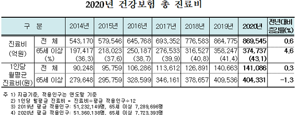 2020³â °Ç°º¸Çè ÃÑ Áø·áºñ´Â 86Á¶ 9545¾ï ¿øÀ¸·Î Àü³â ´ëºñ 0.6% Áõ°¡ÇßÀ¸¸ç, 65¼¼ ÀÌ»ó Áø·áºñ´Â 37Á¶ 4,737¾ï ¿øÀ¸·Î ÀüüÁø·áºñÀÇ 43.1%¸¦ Â÷ÁöÇß´Ù.