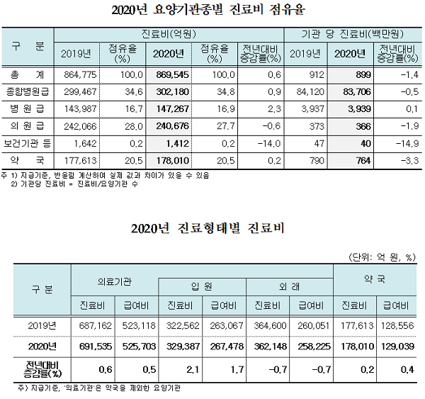 ÀÔ¡¤³»¿ø 1ÀÏ´ç Áø·áºñ´Â 9¸¸ 391¿øÀ¸·Î Àü³â´ëºñ 13.6%Áõ°¡Çß´Ù. 1ÀÎ´ç ¿ùÆò±Õ Áø·áºñµµ 14¸¸ 1086¿øÀ¸·Î Àü³âº¸´Ù 0.3% Áõ°¡ÇßÀ¸¸ç, 2020³â Æò±Õ Àû¿ëÀα¸ÀÇ 1ÀÎ´ç ¿ùÆò±Õ ÀÔ¡¤³»¿øÀϼö´Â 1.56ÀÏ·Î Àü³â´ëºñ 11.9% °¨¼ÒÇß´Ù.