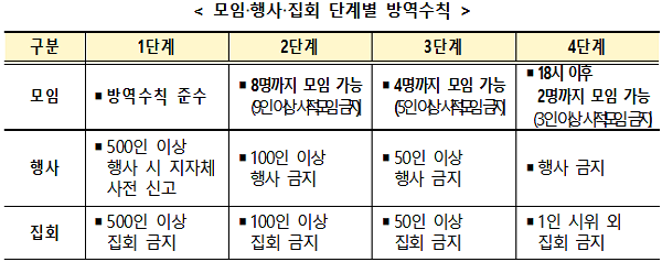 Áýȸ‧½ÃÀ§´Â ±¸È£, ³ë·¡ µî ºñ¸» ¹ß»ý À§Çèµµ°¡ ³ôÀº Ȱµ¿À» µ¿¹ÝÇϹǷΠ500¸í ÀÌ»ó ±ÝÁö(1´Ü°è), 100¸í ÀÌ»ó ±ÝÁö(2´Ü°è), 50¸í ÀÌ»ó ±ÝÁö(3´Ü°è), 1ÀÎ ½ÃÀ§ ¿Ü ±ÝÁö(4´Ü°è)¸¦ Àû¿ëÇÑ´Ù.
