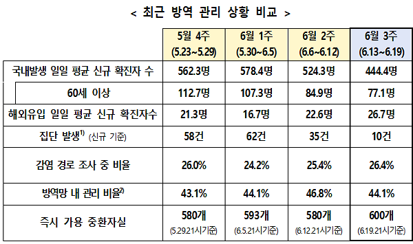 ÇÑ ÁÖ°£ 1ÀÏ Æò±Õ ±¹³» ¹ß»ý È®ÁøÀÚ´Â 3¿ù ¸¶Áö¸·ÁÖ(3¿ù 28ÀÏ ~ 4¿ù 3ÀÏ) 477.3¸í¿¡¼ 4¿ù µÑ°ÁÖ(4¿ù 4~10ÀÏ) 579.3¸íÀ¸·Î 102¸íÀÌ Áõ°¡ÇÑ ÈÄ 6¿ù ÃʱîÁö 12ÁÖ°£ 500~600¸í »çÀÌ¿¡¼ ³·¾ÆÁöÁö ¾Ê´ø »óȲÀ̾úÀ¸³ª, 6¿ù µÑ°ÁÖ(6¿ù 6~12ÀÏ)ºÎÅÍ 500¸í ÃʹÝÀ¸·Î ³·¾ÆÁø ÈÄ, Áö³ÁÖ¿¡´Â 400¸í´ë·Î ÁÙ¾îµç °ÍÀÌ´Ù.