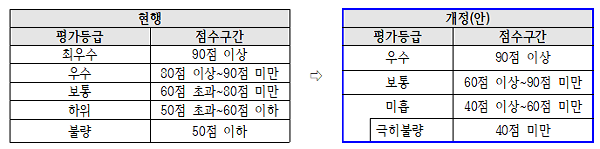 Æò°¡µî±ÞÀº ±âÁ¸ 5°³ µî±Þ ±¸ºÐ(ÃÖ¿ì¼ö-¿ì¼ö-º¸Åë-¹ÌÈí-ºÒ·®)¿¡¼­ 3´Ü°è µî±Þ ±¸ºÐ(¿ì¼ö-º¸Åë-¹ÌÈí)À¸·Î º¯°æÇϵÇ, ¹ÌÈí µî±Þ°úÁ¦ Áß ¡®¼öÇà°úÁ¤ÀÌ ºÎÀûÀýÇϰųª °èȹ´ëºñ ¼º°ú°¡ ¸Å¿ì ¹ÌÈí¡¯ÇÑ °æ¿ì¿¡ °úÁ¦Æò°¡´Ü¿¡¼­ ¡®±ØÈ÷ºÒ·®¡¯ µî±ÞÀ¸·Î ³ª´«´Ù.