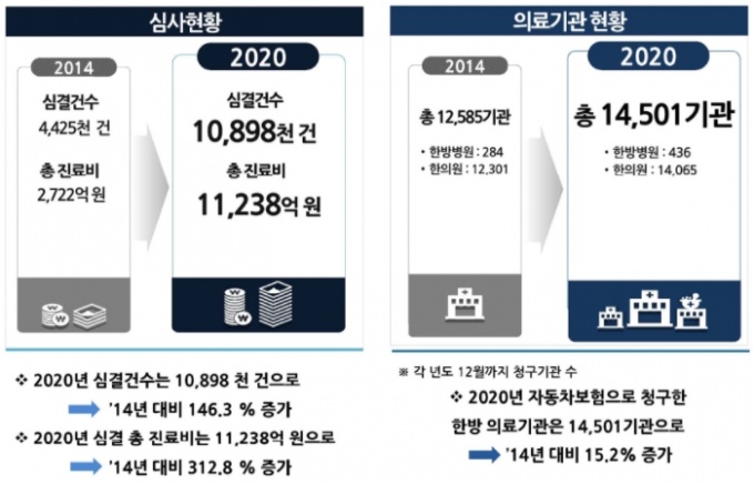 ½ÉÆò¿ø¿¡ µû¸£¸é Áö³ÇØ Çѹæ ÀÚµ¿Â÷º¸Çè ½É»ç°áÁ¤ °Ç¼ö´Â 1,089¸¸°ÇÀ¸·Î Áö³ 2014³â(442¸¸°Ç) ´ëºñ 146.3% Áõ°¡Çß´Ù. ÀÌ¿¡ µû¶ó Áö³ÇØ ½É»ç°áÁ¤µÈ ÃÑ Áø·áºñ´Â 2014³â 2,722¾ï¿ø¿¡¼ 2020³â 1Á¶1,238¾ï¿øÀ¸·Î 312.8% ´Ã¾ú´Ù.
