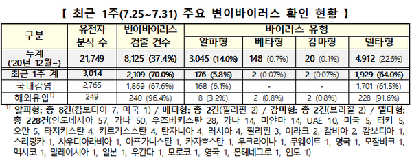 Äڷγª19 È®ÁøÀÚÀÇ À¯ÀüÀÚ ºÐ¼® °á°ú, ¸ðµÎ 2109°ÇÀÇ º¯ÀÌ ¹ÙÀÌ·¯½º°¡ Ãß°¡·Î È®ÀεŠÁö³­ÇØ 12¿ù ÀÌÈÄ 7¿ù 30ÀÏ 0½Ã ÇöÀç±îÁö È®ÀÎµÈ º¯ÀÌ ¹ÙÀÌ·¯½º´Â ¸ðµÎ 8125°ÇÀÌ´Ù. ÀÌ Áß 240°ÇÀº ÇØ¿Ü À¯ÀÔ »ç·Ê¿´°í, 1869°ÇÀº ±¹³» °¨¿° »ç·Ê¿´´Ù.