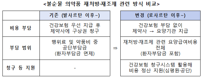 ÀÌ¿¡ µû¶ó À̹ø ·Î»ç¸£Åº ºÒ¼ø¹° °ËÃâ¿¡ µû¸¥ ÀǾàǰ ±³È¯ ¹× Àç󹿡¤ÀçÁ¶Á¦ ºñ¿ëÀº Á¦¾à»ç°¡ ¿ä¾ç±â°ü¿¡ °ð¹Ù·Î ÁöºÒÇØ¾ß ÇÑ´Ù. ±âÁ¸¿¡´Â ±¹¹Î°Ç°­º¸Çè°ø´ÜÀÌ °Ç°­º¸ÇèÀ» ¿ì¼± Áö±ÞÇÑ ÈÄ Á¦¾à»ç¿¡ ±¸»ó±ÇÀ» û±¸ÇÏ´Â ¹æ½ÄÀ̾ú´Ù.
