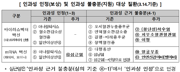 ¡¯Àΰú¼º ºÒÃæºÐ¡® ´ë»ó ±âÁØÀº ±¹³»¡¤¿Ü °ø½Å·Â ÀÖ´Â ±â°ü¿¡¼­ Äڷγª19 ¿¹¹æÁ¢Á¾°ú ÀÌ»ó¹ÝÀÀ °£ Àΰú¼ºÀÇ °¡´É¼ºÀÌ Á¦±âµÇ°Å³ª, Åë°èÀû ¿¬°ü¼ºÀ» Á¦½ÃÇÏ´Â °æ¿ì¿¡ Àû¿ëÇϰí, ¡¯Àΰú¼º ºÒÃæºÐ¡® ´ë»ó ÁúȯÀ» ±âÁ¸ 7Á¾¿¡¼­ 11Á¾(½É±Ù¿° Á¦¿Ü)À¸·Î È®´ëÇß´Ù.