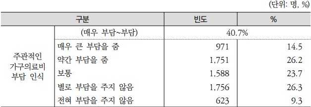 7ÀÏ Çѱ¹º¸°Ç»çȸ¿¬±¸¿ø ¡®2019³â Çѱ¹ ÀÇ·áÆÐ³Î ±âÃʺм®º¸°í¼­(¥±)¡¯¿¡ µû¸£¸é Àüü ÀÀ´äÀÚÀÇ 40.7%°¡ ¡®¿¬°£ °¡±¸ÀÇ·áºñ ÁöÃâÀÌ ºÎ´ã½º·´´Ù¡¯°í ´äÇß´Ù. ÇØ´ç Á¶»ç´Â Àüü 6689°¡±¸(Àüü °¡±¸¿ø 1¸¸4741¸í)À» ´ë»óÀ¸·Î ÁøÇàµÆ´Ù.