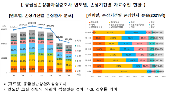 ÀÀ±Þ½Ç(23°³ º´¿ø)¿¡ ³»¿øÇÑ ¼Õ»óȯÀÚµµ 2019³â(27¸¸ 7372¸í) ÀÌÈÄ °¨¼ÒÇØ 2020³â¿¡´Â 20¸¸ 6887¸í, 2021³â¿¡´Â 19¸¸ 496¸íÀ¸·Î Á¶»çµÆ´Ù.