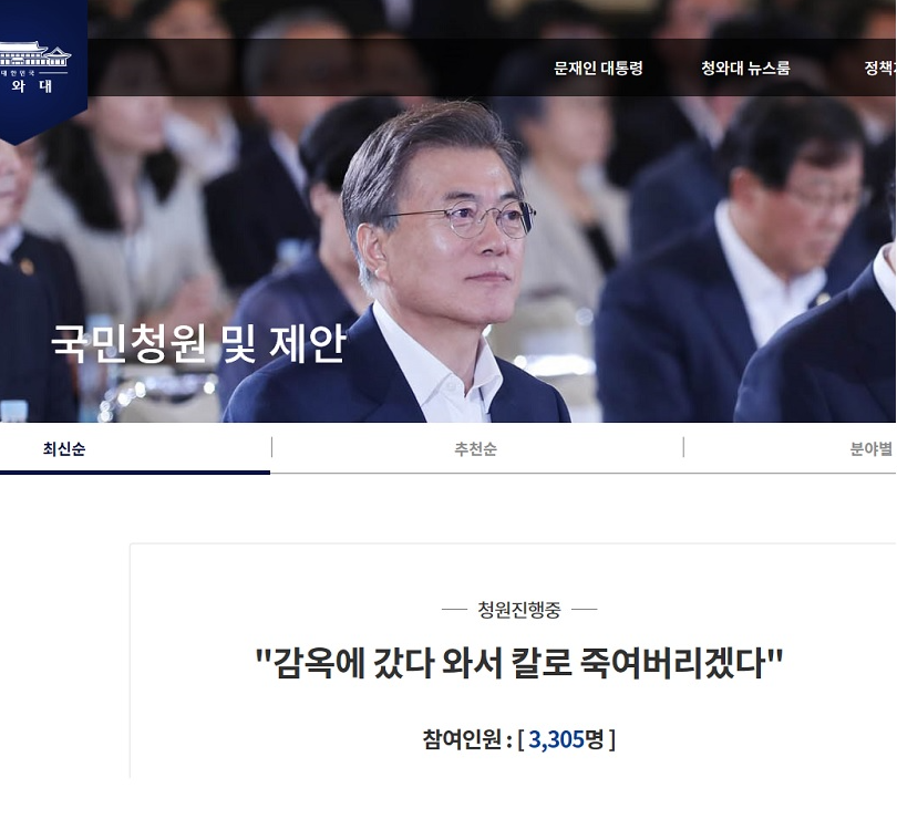 Áö³­ 3ÀÏ Ã»¿Í´ë ±¹¹Îû¿ø °Ô½ÃÆÇ¿¡´Â ¡°°¨¿Á¿¡ °¬´Ù ¿Í¼­ Ä®·Î Á׿©¹ö¸®°Ú´Ù¡±´Â Á¦¸ñÀÇ ±ÛÀÌ °ÔÀçµÆ´Ù.