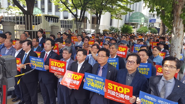 Âü¼®ÀÚµéÀº Áýȸ ½ÃÀÛ 30ºÐ ÀüÀÎ ¿ÀÈÄ 1½Ã 30ºÐºÎÅÍ ¸ð¿© ¡®ÀÇ·á±â°ü ÆøÇà¹ß»ý ȯÀÚ»ý¸í À§ÇùÇÑ´Ù¡¯, ¡®ÀÇ·á±â°ü ÆøÇà»ç¹ü °ü¿ë¾øÀÌ Ã³¹úÇ϶ó¡¯, ¡®ÀÇ·á±â°ü ó¹ú¹ý·É ¾ö°ÝÇÏ°Ô °³Á¤Ç϶ó¡¯, ¡®¹Ýº¹µÇ´Â ÀÇ·áÆøÇà ±¹¹Î°Ç° ¹«³ÊÁø´Ù¡¯, ¡®±¹¹Î°Ç° º¸È£À§ÇØ ÀÇ·áÁø º¸È£´ëÃ¥ ¸¶·ÃÇ϶ó¡¯, ¡®ÀÇ·á±â°ü ÆøÇà»ç¹ü °Çº¸ÀÚ°Ý ¹ÚÅ»ÇÏ¶ó¡¯ µîÀÇ ±¸È£¸¦ ¿ÜÄ¡¸ç ÇöÀå ºÐÀ§±â¸¦ ºÏµ¸¾Ò´Ù.